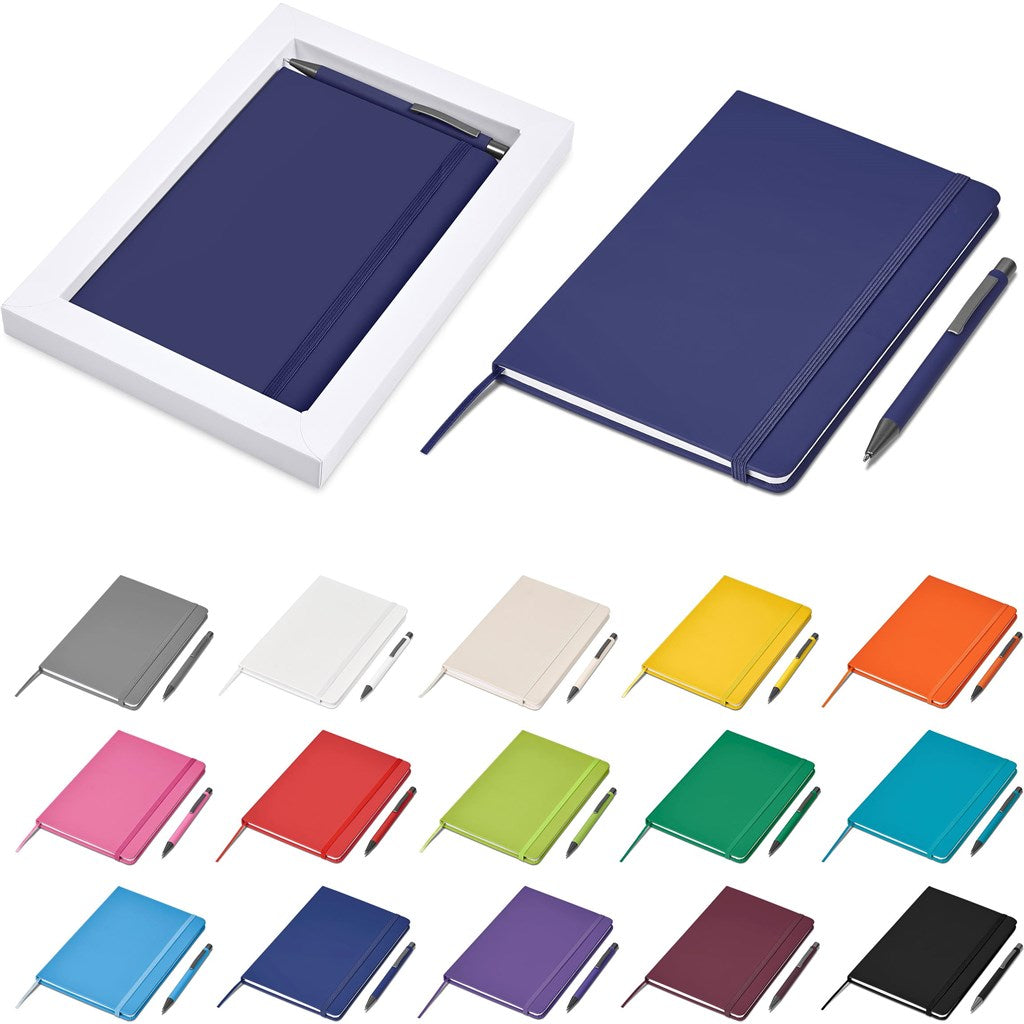 The matching matte textures of this notebook and pen, combined with the colour accents, makes them perfect partners. The set is packaged together in a box with a firm cardboard base and a transparent acetate lid, which provides bright and clear exposure for your branding.